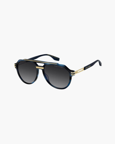 Moderne Eleganz und mutiger Stil zeichnen die Sonnenbrille MARC 876/ von Marc Jacobs aus.S - 38I, entworfen für den Mann, der seine Persönlichkeit hervorheben möchte. Der Pilotenrahmen aus blauem Horn-Effekt-Acetat verleiht einen modernen und raffinierten Touch und eignet sich ideal für lässige oder elegantere Looks. Die dunkelgrauen Verlaufsgläser aus Polyester bieten effektiven UV-Schutz und klare, komfortable Sicht.