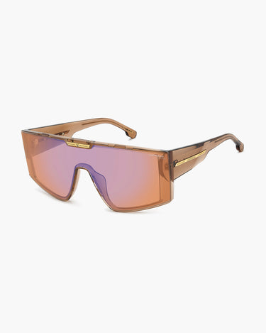 Colorati, leggeri e audaci, gli occhiali da sole CARRERA VICTORY C 18/S - 12J da donna si distinguono per il loro design mascherina futuristico e accattivante. La montatura in poliammide bio color Marrone Arancio unisce stile sostenibile e comfort, offrendo una vestibilità leggera e resistente. Le lenti in policarbonato blu arancio sfumato specchiato donano un effetto visivo unico e garantiscono una protezione solare efficace,